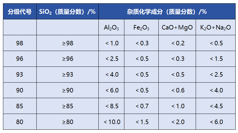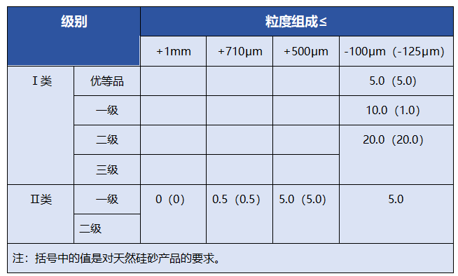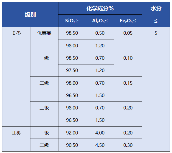 行业标准《JC/T 529-2000 平板玻璃用硅质原料》中有关平板玻璃用石英砂的化学成分、粒度组成等指标要求如下: