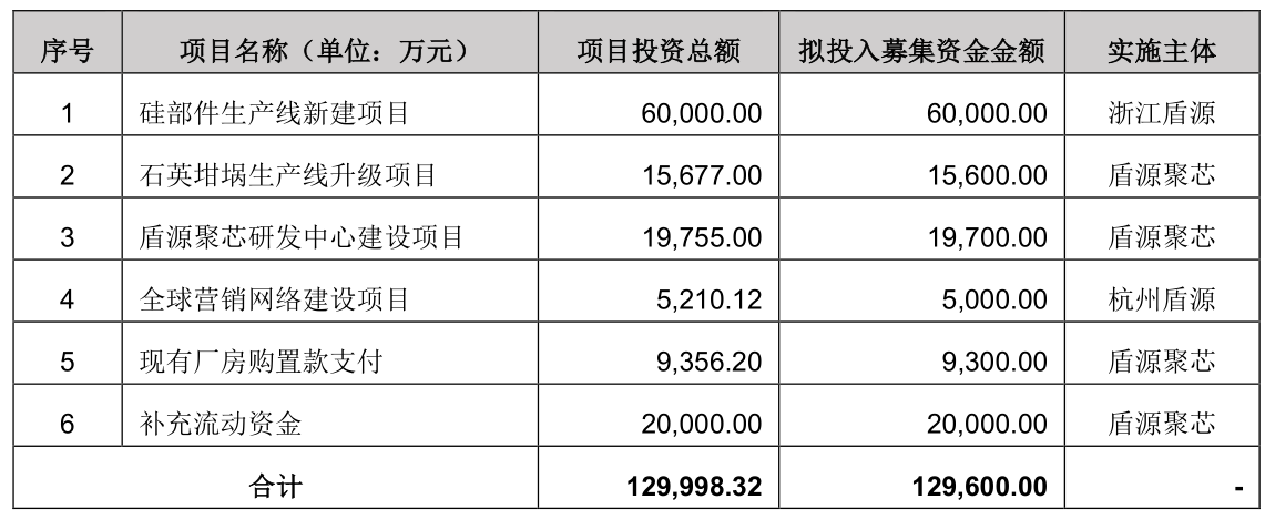 本次募集资金运用均围绕公司主营业务进行。如本次发行成功,募集资金净额拟用于硅部件生产线新建项目(6亿元)、石英坩埚生产线升级项目(1.56亿元)、盾源聚芯研发中心建设项目(1.97亿元)、全球营销网络建设项目(5000万元)、现有厂房购置款支付(9300万元)以及补充流动资金(2亿元)。