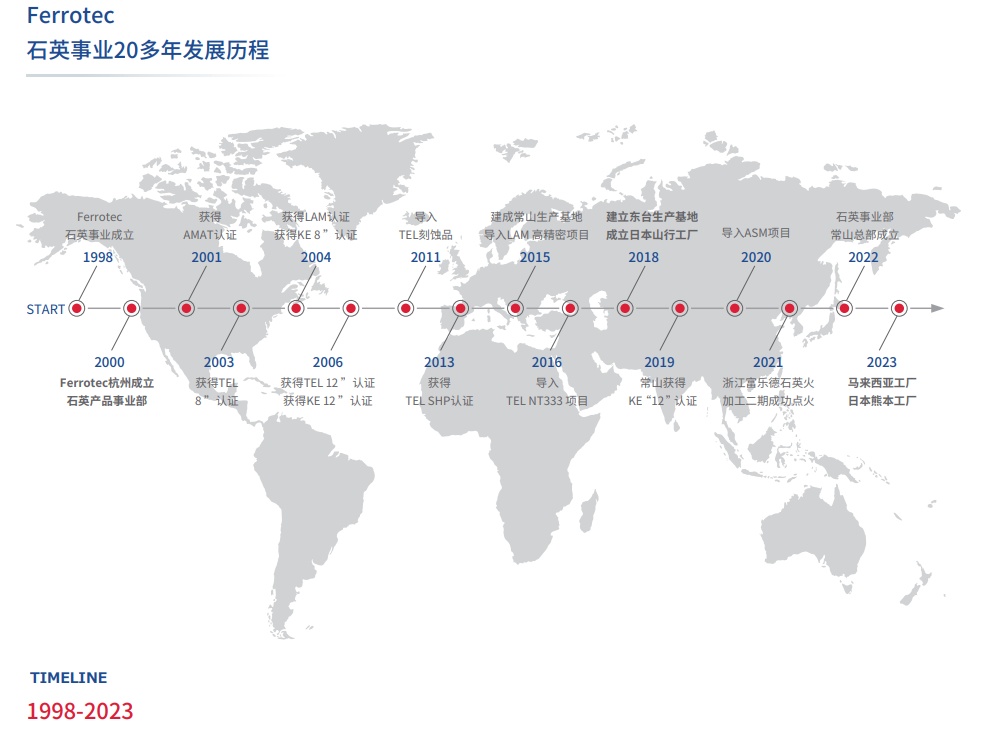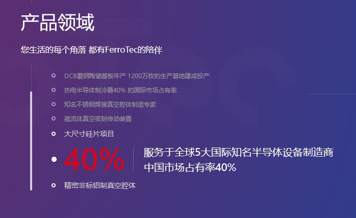 由日本磁性技术控股有限公司于1992年在华设立的企业——FerroTec(中国),其石英制品服务于全球5大国际知名半导体设备制造商,且相关产品据其官网宣传在中国市场的占有率高达40%。这样一家全球石英制品领导者却长期以来不为大多数人所了解。据悉,该公司专业从事半导体硅片、热电半导体致冷材料与器件、半导体石英制品、精密陶瓷制品、半导体真空传动装置及大型腔体、电子束蒸发镀膜机、精密洗净、覆铜陶瓷基板(DCB、AMB、DPC)、半导体装备、单晶炉等产品的研发、制造和销售。