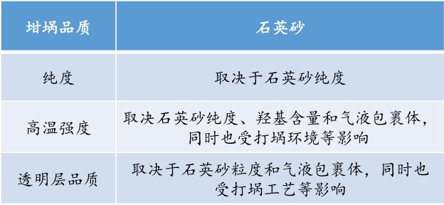 石英坩埚产品质量直接影响直拉单晶硅的品质和成本,而拉晶工艺升级则对石英坩埚纯度、寿命和尺寸提出了更高的要求,进一步激发高端石英坩埚需求。高纯石英砂作为制作石英坩埚的核心原料,其品质水平及成本等级很大程度上决定了石英坩埚的性能及成本。