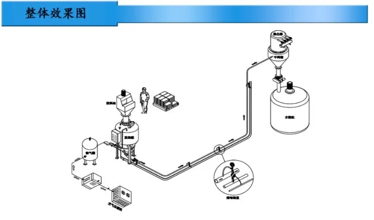 公司自主研发生产的高压连续式输送单元、密相输送仓泵、活化料斗、下料分向阀、均值供料器等产品。公司致力于粉体气力输送系统、系统配套软硬件为一体,提供前期规划设计、设备选型、过程控制、项目施工。业务范围涉及树脂、胶粘剂、锂电、化工新材料、橡塑、食品等多领域。