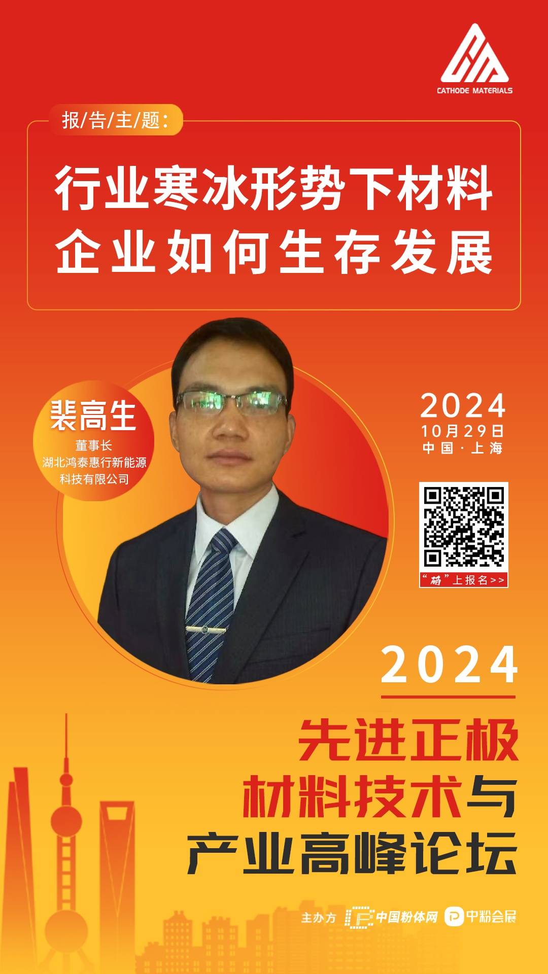 2024年10月29-31日在上海跨国采购会展中心,由北京粉体技术协会与柏德英思展览(上海)有限公司联合主办2024先进正极材料技术与产业高峰论坛。届时,来自湖北鸿泰惠行新能源科技有限公司的裴高生董事长将作题为《行业寒冰形势下材料企业如何生存发展》的报告。会上,裴高生董事长将介绍第四代磷酸铁/磷酸铁锂产品性能,制备技术,当前行业痛点,降本增效方案,产品升级方案和行业破冰出路。