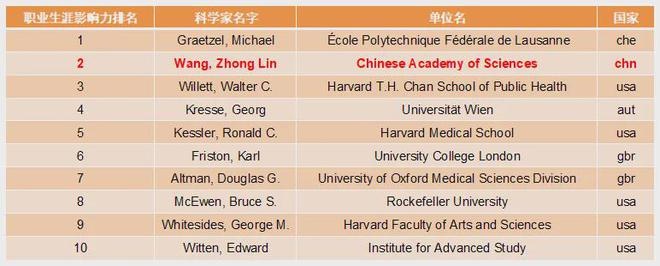 在总排名——职业生涯影响力排名方面,中国科学院北京纳米能源与系统研究所所长王中林院士继续位居第2,也是前100名科学家中唯一的华人学者。