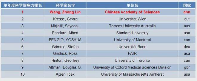 在年度排名——单年度科学影响力排名方面,王中林院士排名第1,自2020年以来已连续5年保持年度排名第1位。