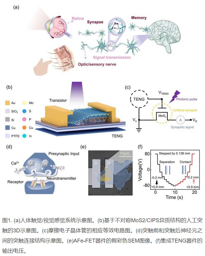 中国科学院北京纳米能源与系统研究所王中林院士和孙其君研究员团队报道了一种基于非对称铁电异质结的多模态机-光-电多模态仿生记忆突触。该人工突触器件由不对称MoS2/CIPS铁电异质结构场效应晶体管(AFe-FET)和集成摩擦电纳米发电机(TENG)单元组成,通过提供摩擦电势来实现门控、编程和突触可塑性。在摩擦电位调制下,该存储器件显示出机械位移衍生的电学性能,包括高开/关比(>107)、大存储窗口(相当于95V)、优异的电荷保持能力(>104 s)和良好的耐久性(>103循环)。基于这些优良的电特性,典型突触行为,如兴奋性突触后电流(EPSC)、成对脉冲易化(PPF)、短时记忆(STM)和长时记忆(LTM)等已被成功地模拟。由于MoS2/CIPS异质结具有出色的光敏性,光照也可以触发突触后电流并更新突触权重,这为摩擦电势和光电可塑性协同调制提供了有效的策略。在协同调制下,实现了多模态时空相关动态逻辑。通过机-光-电塑化的非对称MoS2/CIPS铁电异质结实现的多模态记忆突触显示出优越的电学性能,并成功模拟了一系列生物突触功能,为突触可塑性的多模态调制、多功能感觉记忆、神经形态器件和体现人工智能的类人电子器件提供了一种简便而有前途的策略。