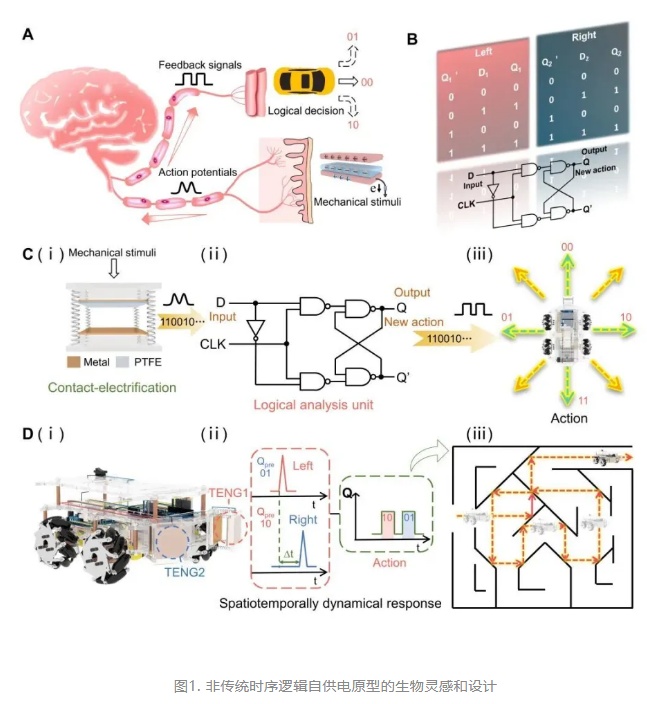 中国科学院北京纳米能源与系统研究所王中林院士和孙其君研究员团队报道了第一个赋能时序逻辑的摩擦纳米发电机原型,这对于低功耗机械驱动逻辑计算和对环境信息的能量自主处理具有重要意义。该原型通过与外部环境的动态交互,利用特征性的机械布尔逻辑功能来响应外部刺激。在这一非传统时序逻辑原型中,摩擦纳米发电机被用来模仿感觉神经元,以自供电和自适应的方式感知外部刺激。施加在摩擦电感觉神经元上的外部/环境机械刺激可以很容易地转换成具有时空信息编码的电压尖峰,由感知单元传输和捕获,并进行分析以提供机械逻辑反馈。此外,该原型还成功模拟了机械竞争和赛跑现象,并提供了有效的解决方案。非传统时序逻辑(或称机械驱动逻辑)计算是数字计算的补充,更适用于人工智能和生物机器人的低功耗感知、决策和响应。这种具身机械时序逻辑的自供电原型为潜在的神经形态计算提供了显著的布尔基础,并在交互式/无监督的机器环境界面中展现出卓越的适应能力。