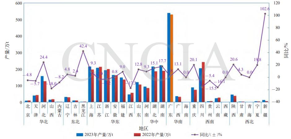 2023年中国涂料行业规模以上企业各省涂料产量分布图