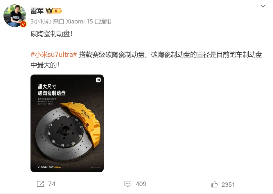 中国粉体网讯 10月28日,小米董事长兼CEO雷军在微博透露,小米SU7 Ultra量产版搭载赛级碳陶瓷制动盘,“碳陶瓷制动盘的直径是目前跑车制动盘中最大的!”