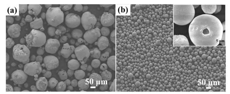 不同方法制备的YSZ空心颗粒:(a)喷雾干燥法;(b)喷雾干燥和等离子体烧结联用