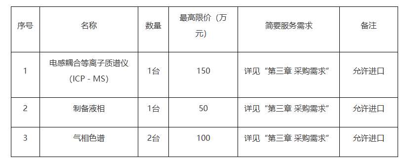 气相色谱、制备液相、电感耦合等离子质谱仪(ICP-MS) 招标项目的潜在投标人应在浙江豪圣建设项目管理有限公司(杭州市拱墅区大关路 179 号远洋国际 A 座 17 楼 1706 室)获取招标文件,并于2024年12月18日 09点30分(北京时间)前递交投标文件。
