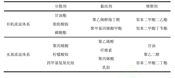 流延成型的浆料中,除了决定产品特征的粉体和作为分散介质的溶剂,还需要有分散剂、黏结剂和增塑剂等添加剂,这些添加剂对浆料的分散性和稳定性以及流延素坯的强度和韧性有着重要影响。