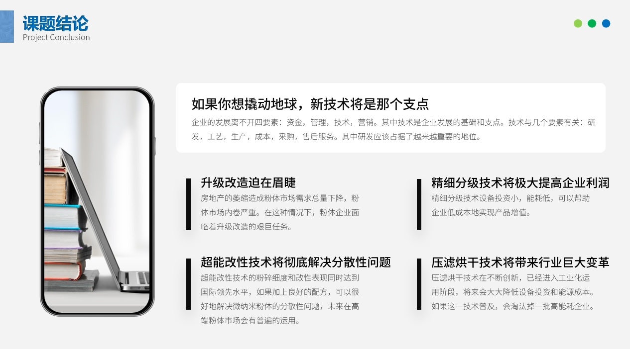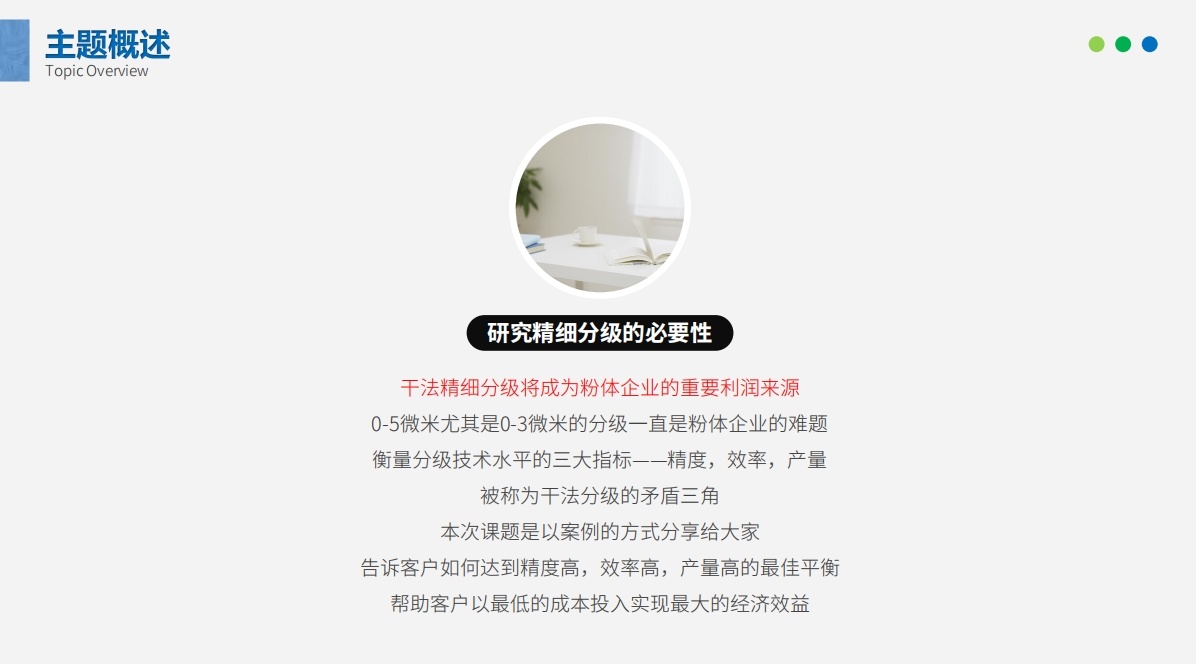 3. 0-5微米尤其是0-3微米的干法分级一直是粉体企业的难题。衡量干法分级优劣的三大指标——精度高,效率高,产量高被称为干法分级的矛盾三角,很难做到相对均衡。
