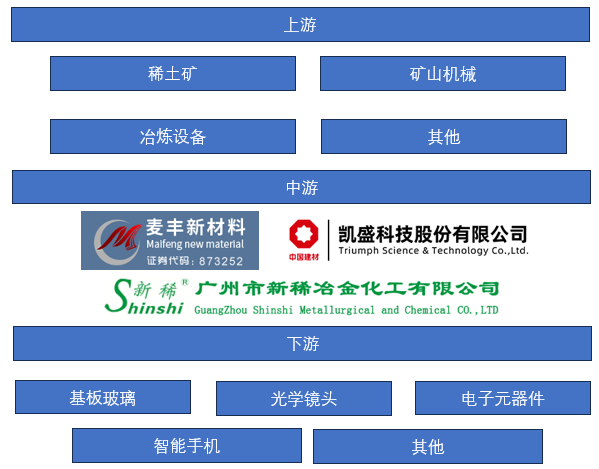稀土抛光粉行业产业链上游原材料为稀土,目前我国稀土抛光材料的市场份额占抛光材料市场 85%以上,近些年,为保护和合理开发优势矿产资源,相关部门多次对部分矿种进行保护性和限制性开发,稀土矿、钨矿等都曾是我国特定矿种,实行开采总量控制,由于资源的有限性,我国稀土抛光粉行业面临较大的上游行业风险。稀土抛光粉行业下游主要是光学玻璃、盖板玻璃、电子元器件、智能手机等行业。