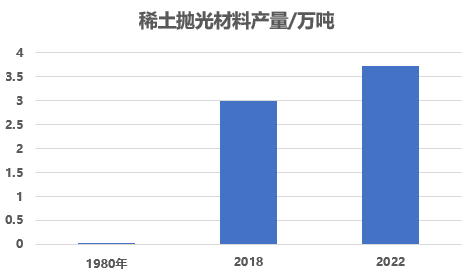 20世纪60年代开始,中国就开始大量生产稀土抛光粉,主要以混合稀土抛光粉、石膏石和纯氧化铈等为原料。到了 20 世纪 70 年代,稀土抛光粉已经代替了常规的氧化铁,用于玻璃打磨。20世纪90年代,中国稀土抛光粉材料的制备、应用以及生产技术方面都获得了长足的发展。稀土抛光材料领域出现了从传统玻璃表面加工到光电子显示产品的新发展,从传统应用到光电高科技应用的改进。在产量方面,国内稀土抛光材料的应用从20世纪80年代的不到40吨增加到2018年的3万吨左右。2022 年,我国稀土抛光材料产量达到 3.73 万吨,居世界第一。