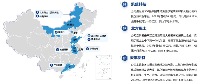 国内稀土抛光粉生产商主要有凯盛科技、北方稀土、麦丰新材、广州新稀、昊锐稀土、华明高纳、鑫方园、佳鑫纳米、荣瑞达、国瑞升等。其中凯盛科技是世界500强中国建材集团以玻璃新材料为核心的科技创新产业平台。北方稀土是我国最早建立并发展壮大的国有控股稀土企业,实现了稀土上中下游一体化发展,构筑了行业领先的全产业链竞争优势。麦丰新材主营业务为稀土抛光粉及抛光液,二氧化硅抛光液,氧化铝抛光粉及抛光液,氧化锆抛光粉及抛光液,稀土纳米材料的研发、生产、销售。