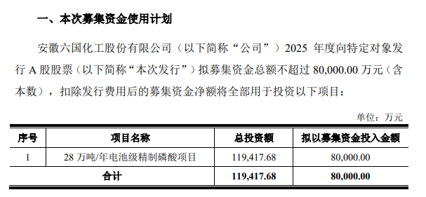 中国粉体网讯 1月7日,六国化工披露公告称,公司拟向包括公司控股股东铜陵化学工业集团有限公司(以下简称“铜化集团”)在内的不超过35名特定投资者发行股票,募集资金总额不超过8亿元,扣除发行费用后将全部用于投资28万吨/年电池级精制磷酸项目。
