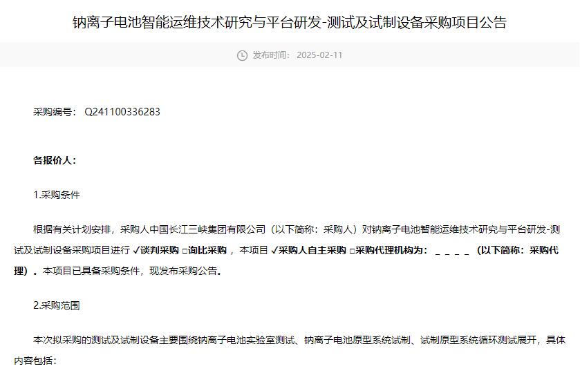 2月11日,钠离子电池智能运维技术研究与平台研发-测试及试制设备采购项目公告发布,项目采购人为中国长江三峡集团有限公司。本次拟采购的测试及试制设备主要围绕钠离子电池实验室测试、钠离子电池原型系统试制、试制原型系统循环测试展开。
