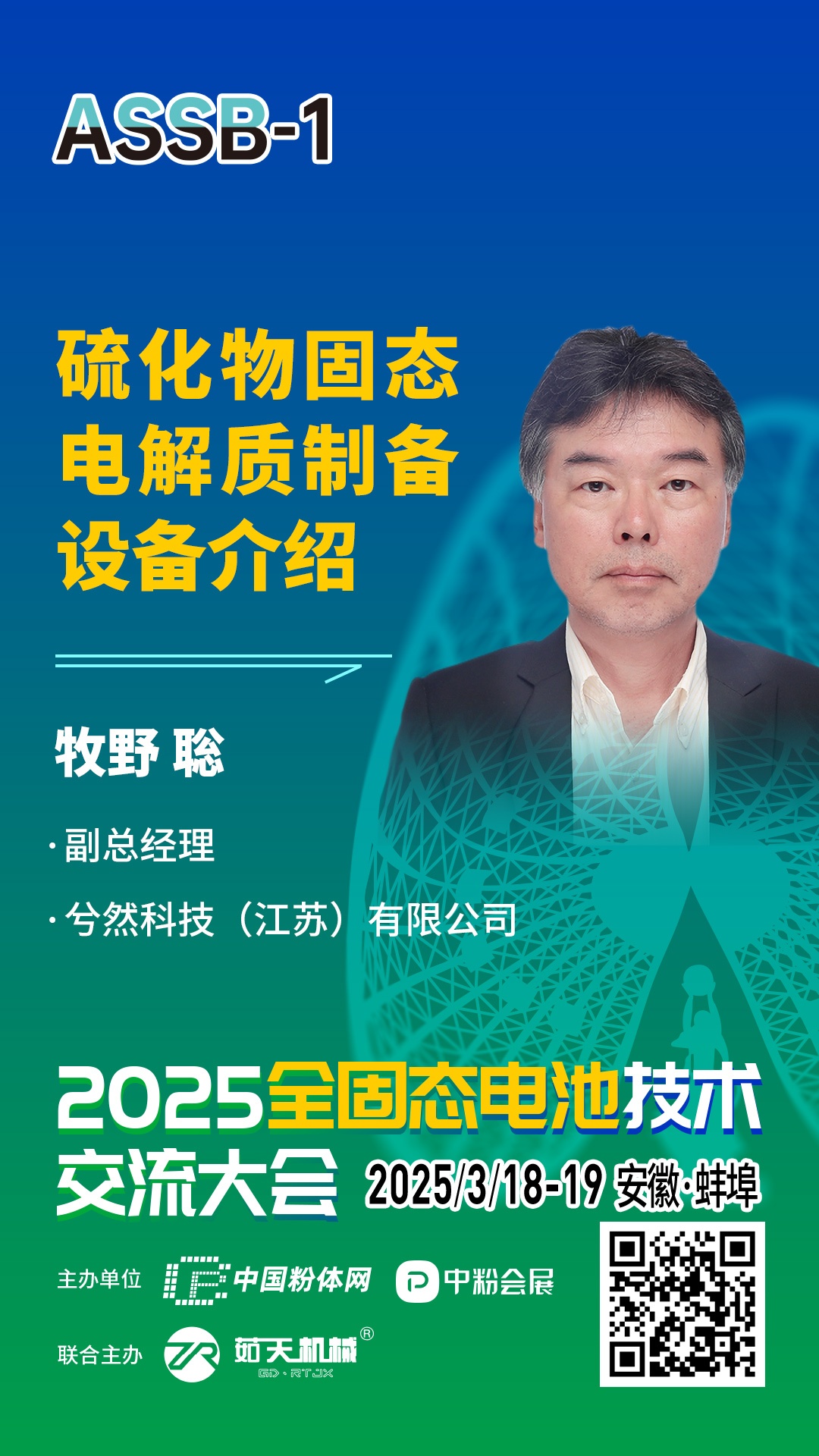 针对固态电池相关的技术、材料、市场及产业等方面的问题,中国粉体网将于2025年3月18-19日在安徽·蚌埠举办2025全固态电池技术交流大会暨第一届干法电极技术研讨会。为致力于固态电池技术开发的企业,科研院校,以及新能源汽车、储能、消费电子等终端企业提供信息交流的平台,开展产、学、研合作,助推固态电池产业化发展。届时,来自兮然科技(江苏)有限公司的牧野 聡副总经理将作题为《硫化物固态电解质制备设备介绍》的报告。