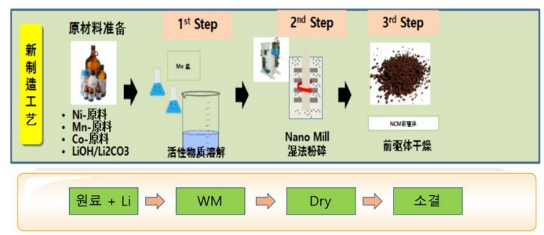 采用无前驱体法的正极制造工艺原理如下图所示,Ni-原料、Mn-原料、Co-原料(金属氧化物或金属氢氧化物),同时加入锂原料和待掺杂原料,溶解+分散+干燥。因为减少了中间前驱体工艺,从原料到正极材料的成品率大于70%,较传统工艺大大改善。
