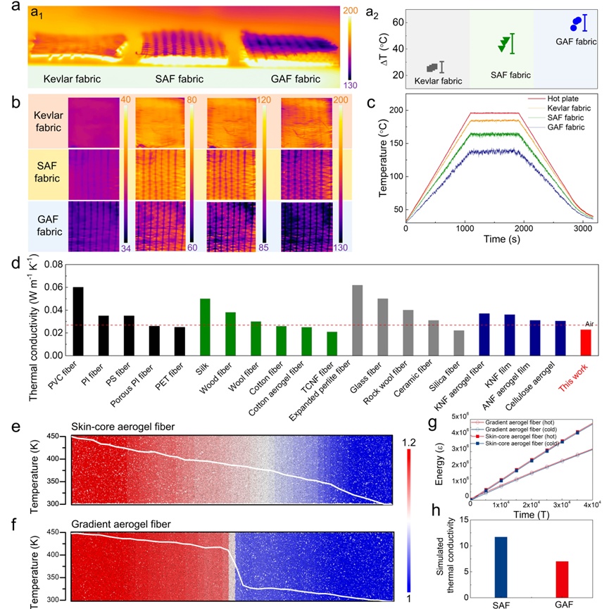 在超临界干燥过程中,纤维表面的“外疏内密”结构发生反转,最终形成梯度全纳米结构的芳纶气凝胶纤维(GAFs)。实验表明,这种纤维的径向热导率低至0.0228 W/mK,比空气(0.026 W/mK)还要低,较传统气凝胶纤维降低了30%-67%。