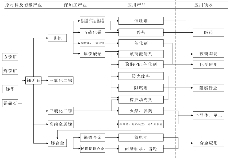 锑产业链主要包括锑矿的开采与加工、锑产品的生产、以及产品的应用等环节。锑产业链的上游主要为锑矿的开采与加工,锑矿主要包括辉锑矿(硫化锑)和蓝辉锑矿等;锑矿加工是将锑矿石经过选矿、冶炼等加工过程,转化为锑金属或其他锑化合物。辉锑矿经过冶炼可得到锑的金属形态,而其他含锑矿石则需经过化学加工转化为锑的化合物。