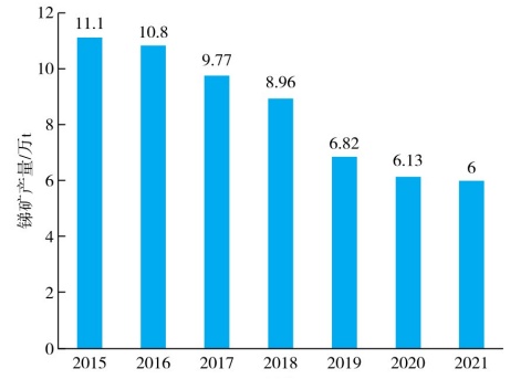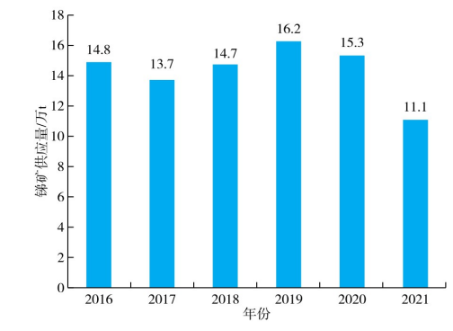 我国一直是世界最大的锑生产国,占世界总锑生产量的80%以上。2018-2020年锑价格低迷导致高成本矿山产能退出,此外由于国内矿山资源枯竭及环保治理,海外也有部分锑矿山资源枯竭,造成锑矿供应量由2020年的15.3万t降低至2021年的11.1万t,形成锑产业供需失衡。