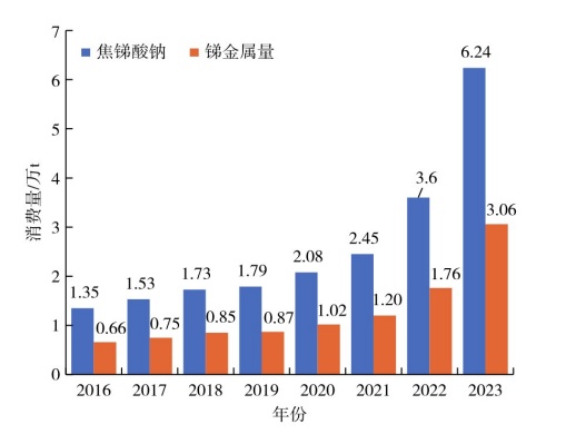 随着光伏行业技术的进步,2020年起光伏实现平价发电,随之对锑的需求也迅速增长,从2020年焦锑酸钠消费量1.02万t金属量增长到2023年的3.1万t金属量。在锑资源供应紧张及光伏需求拉动的双重因素下,锑价格暴涨,精锑价格由2020年最低3.4万元/t上涨至2024年最高16万元/t,突破历史最高价格。