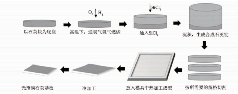 以化学气相沉积法(CVD)为例,合成石英的制造是以SiCl4作为原料,在氢氧焰中高温水解或氧化生成SiO2微粒,沉积熔化形成透明的高纯石英锭。根据光掩模石英玻璃基板的规格将石英锭割成相应尺寸的石英块,通过热加工方式形成石英板。经过一系列的冷加工如切割、开方、倒角、磨抛等工艺的石英板最终形成光掩模石英玻璃基板。