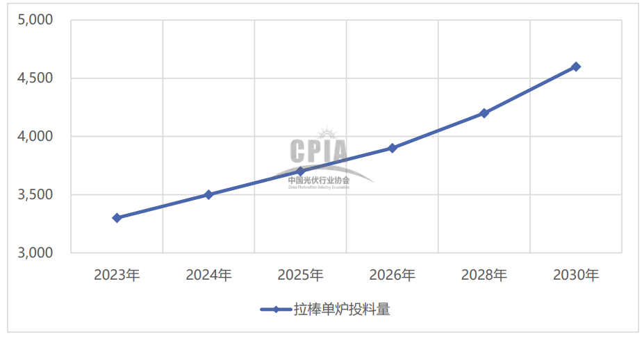 最新版的《中国光伏产业发展路线图(2024-2025年)》指出,拉棒单炉投料量是指一只坩埚用于多次拉棒生产的总投料量,其中坩埚使用时间为关键因素之一。2024年,拉棒单炉投料量约为3700kg,较2023年的3300kg有较大幅提升,主要是由于大尺寸热场配置的增加及其稳定性的提高、坩埚质量不断提升等原因。未来随着坩埚制作工艺、拉棒技术的不断提升以及坩埚使用的优化,投料量仍有较大增长空间,或向着连续投料的方向发展。