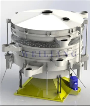 伟良S49三次元振动筛是一种振动筛分装置,它围绕它的重 心来振动。振动是通过运动发生器轴杆上部与底端的偏心重量块来产生的。"智能锁紧装置"的顶部重量块的旋转可产生水平面内的振动,导致物料穿过筛布向边缘移动。底部重量块产生垂直和切向激振力,使机器倾斜。下部重量块相对于上部重量块的超前角提供了螺旋筛分形态的变化控制,操作人员可以设定物料穿过筛面的速度和螺旋状形态,以便为任何物料提供较大的处理能力和筛分效率。