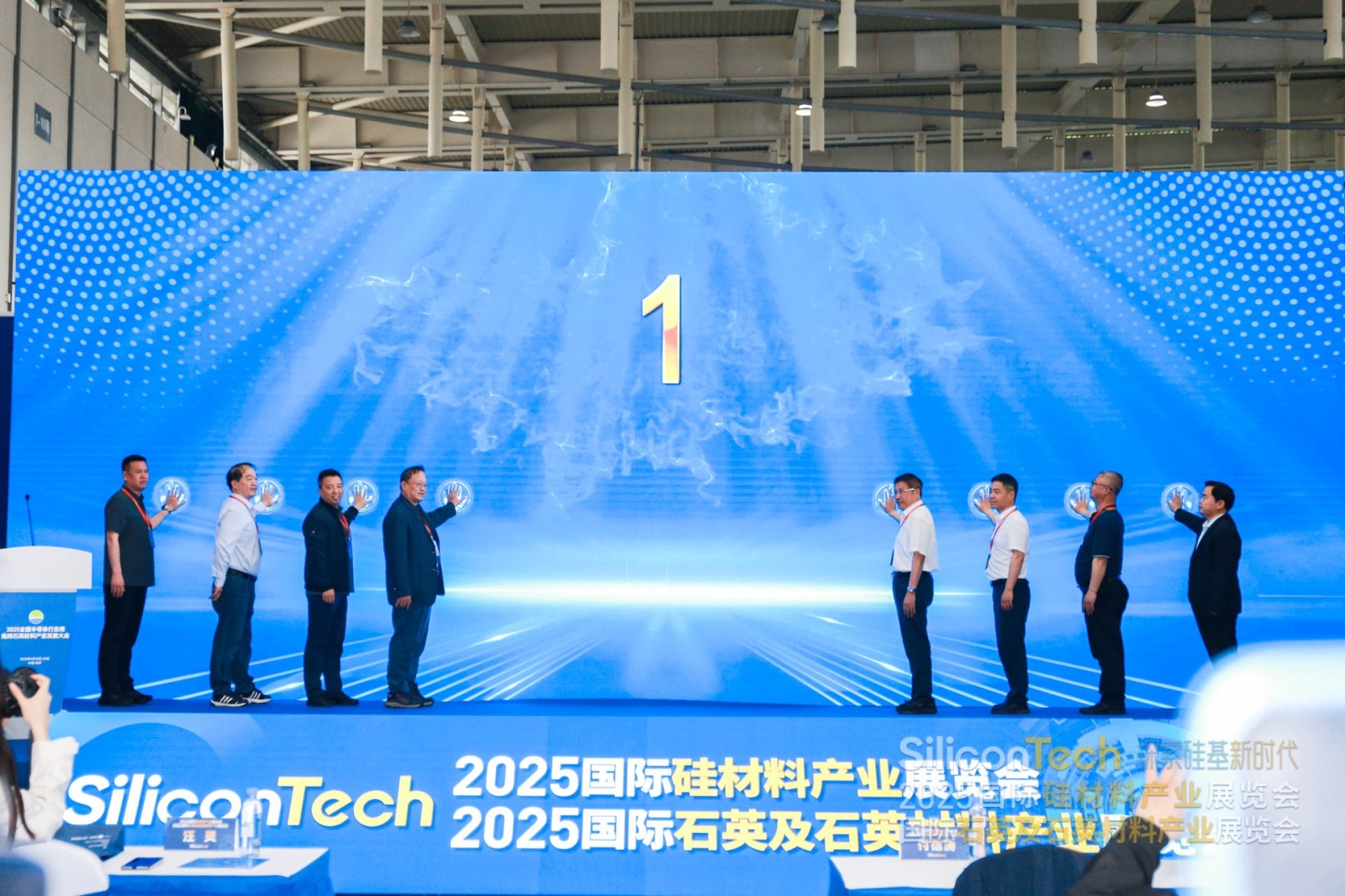 成都理工大学汪灵教授,中国科学技术大学杨晓勇教授,先进玻璃材料全国重点实验室的副总工程师、中建材玻璃新材料研究院集团有限公司科技委委员、教授级高工吴建新,全国石材标准化技术委员会周俊兴秘书长,武汉理工大学李育彪教授,中国科学院过程工程研究所袁方利研究员,合肥谷鑫电子科技有限公司总经理桑海博、中国粉体网总经理付信涛等领导、专家、企业家同时按下启动仪式按钮,共同见证国际硅材料产业的一大盛事。