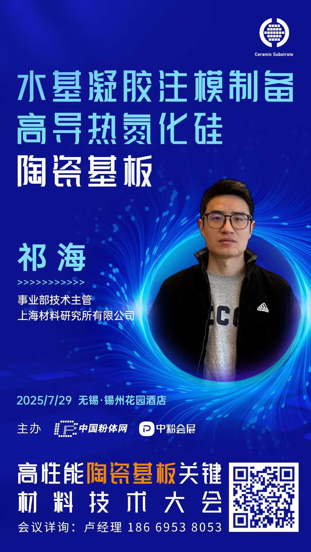 半导体及电子信息产业的快速发展对核心材料的性能提出了更高要求。陶瓷基板作为功率半导体器件的关键封装材料,其导热性能、机械强度、可靠性和精密程度直接决定了终端产品的性能与寿命。针对材料研发、制备工艺、检测技术、应用场景等核心议题,中国粉体网将于2025年7月29日在江苏无锡举办2025年高性能陶瓷基板关键材料技术大会。届时,上海材料研究所有限公司高级工程师祁海将作题为《水基凝胶注模制备高导热氮化硅陶瓷基板》的报告,上海材料研究所针对目前高导热氮化硅陶瓷基板产业化存在的技术问题,探索采用安全环保型的水基凝胶注模成型方式制备高导热氮化硅陶瓷基板,该技术路线能够解决目前行业内大量采用有机溶剂带来的急慢性中毒、易燃易爆等安全环保隐患问题,且相对于流延成型技术路线,采用的粘结剂含量低(最低可至2wt%以下),素坯密度高、强度高,烧结收缩小、良品率高。目前上海材料研究所已经采用水基凝胶注模成型技术路线成功制备出高导热氮化硅陶瓷基板,热导率达到85W/(m•K)以上,抗弯强度达到800MPa以上。