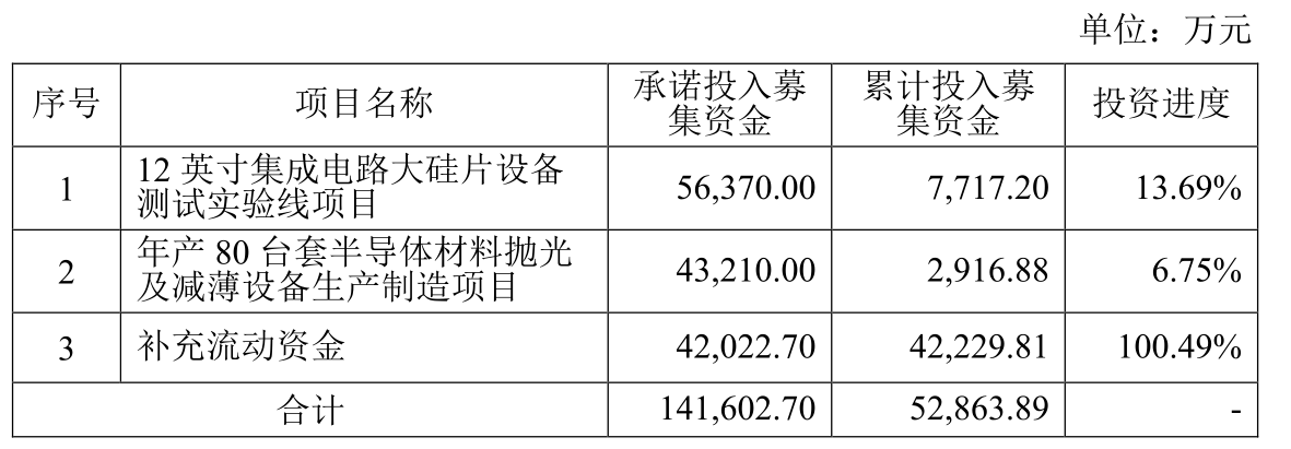 另外,公司全资子公司晶鸿精密依托多年高端精密加工设备投入和高级技术人才储备建设,已发展为拥有精密加工、特种焊接、组装测试、半导体级表面处理等核心制造能力的半导体核心零部件供应商,通过打造核心零部件制造基地,构建了涵盖腔体与结构件(传输腔体、反应腔体、真空腔体等)、功能组件(气体分配盘、精密传动装置、磁流体密封装置、超导磁体等)、耗材与密封件(圆环类组件、腔体遮蔽件、半导体阀门管件等)三大核心产品矩阵,不断提升半导体产业链关键零部件的配套服务能力,已能够逐步满足公司抛光减薄设备核心零部件需求,为进一步提高募集资金的使用效率、避免重复建设,经审慎决定,公司决定不再投建该项目后续的零部件加工设备投入。