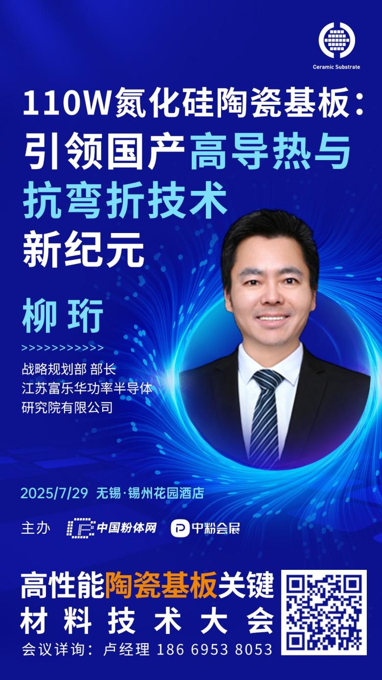 半导体及电子信息产业的快速发展对核心材料的性能提出了更高要求。陶瓷基板作为功率半导体器件的关键封装材料,其导热性能、机械强度、可靠性和精密程度直接决定了终端产品的性能与寿命。针对材料研发、制备工艺、检测技术、应用场景等核心议题,中国粉体网将于2025年7月29日在江苏无锡举办2025高性能陶瓷基板关键材料技术大会。届时,江苏富乐华功率半导体研究院有限公司战略规划部部长柳珩将作题为《110W氮化硅陶瓷基板:引领国产高导热与抗弯折技术新纪元》的报告,报告中就110W氮化硅陶瓷基板的优异性能及广泛应用进行介绍。