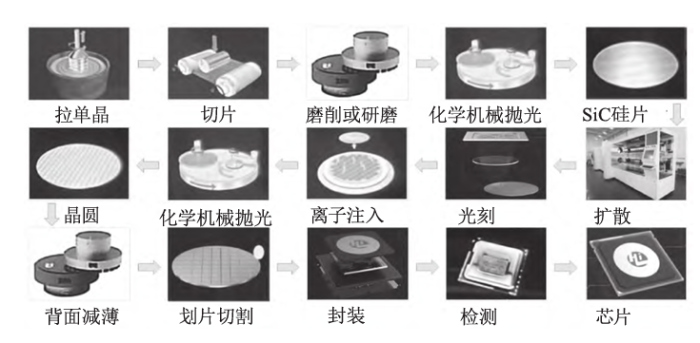 中国粉体网讯 碳化硅功率器件的制造流程极其复杂,通常包含上百道工序,可简单分为单晶碳化硅晶圆片的制造、前端工艺和后端工艺三个步骤。其中,单晶碳化硅晶圆片的制造主要包括晶锭拉伸、晶锭切片等工艺流程,目标获得一定厚度的高质量碳化硅晶圆片。而晶圆划片切割工序是连接前端和后端工艺的一个重要工艺流程。