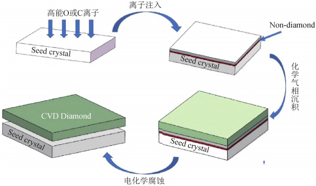 将CVD金刚石层从籽晶上剥离出来,需要利用离子注入技术。使用激光切割方法分离外延层时,会损耗掉一部分的金刚石,且损耗的比例随着金刚石片的尺寸增加而变大。离子注入技术预先使用高能粒子对衬底进行轰击,在预先抛光过的金刚石籽晶表面之下约几百纳米处形成非金刚石相,损伤层深度由注入的离子能量决定。经过离子注入的金刚石籽晶继续利用同质外延技术生长单晶金刚石,随后利用电化学腐蚀技术将非金刚石相去除,达到分离衬底的目的。