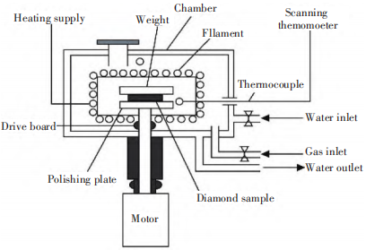 机械抛光(MP):MP是利用金刚石与高速旋转的抛光盘(铸铁盘、砂轮盘)相互摩擦产生脆性断裂去除表面材料的抛光工艺,同时,由于高速旋转的抛光盘与金刚石摩擦会产生高温,而高温提供了“硬”的金刚石相向“软”的石墨相转变的驱动力,通过利用微切削与石墨化相结合的原理实现金刚石的抛光。
