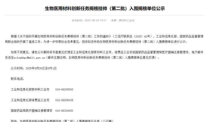 中国粉体网讯 2025年8月26日,工信部发布了《生物医用材料创新任务揭榜挂帅(第二批)入围揭榜单位公示》。