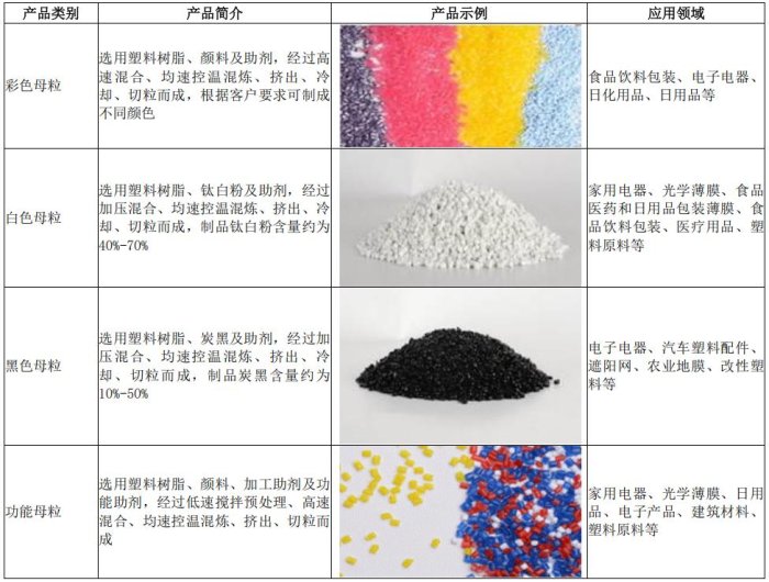 公司的主要产品为色母粒,有彩色母粒、白色母粒、黑色母粒和功能母粒等四大产品类别,广泛应用于PE、PP、AS、PET、EVA、ABS等塑料制品领域,并最终应用于电子电器、日用品、食品饮料、日化、建材、农业、汽车、医疗等行业。