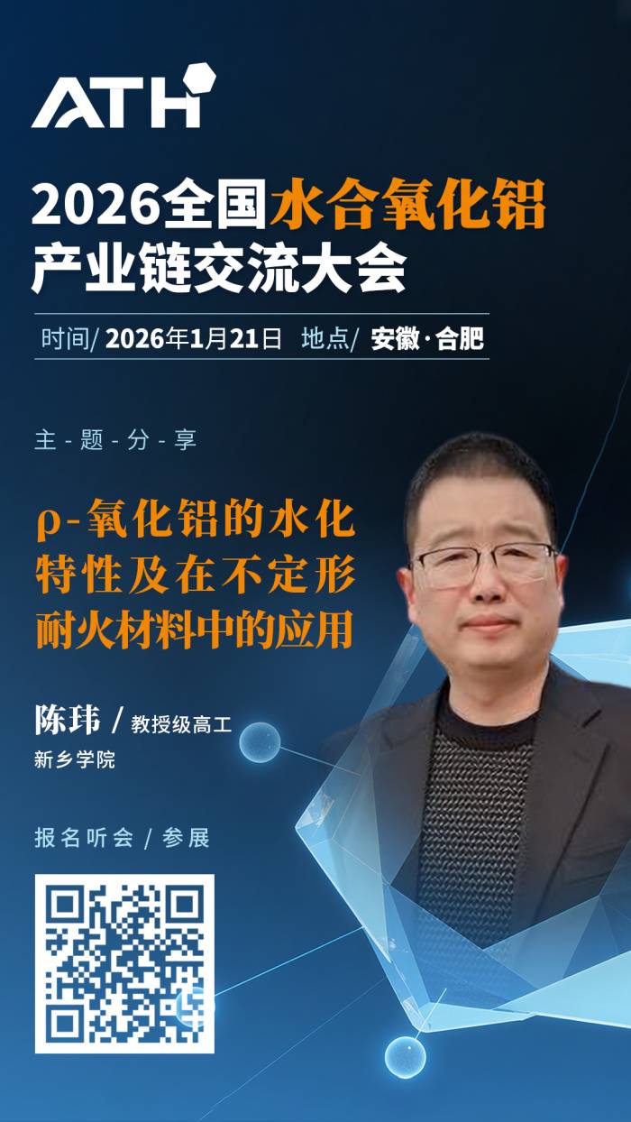 1月21日,中国粉体网将在安徽合肥举办“2026全国水合氧化铝产业链交流大会”。为进一步了解ρ-氧化铝的水化特性,以帮助相关从业者提高生产、施工质量,主办方有幸邀请到新乡学院陈玮教授出席大会并作题为《ρ-氧化铝的水化特性及在不定形耐火材料中的应用》的报告。届时,陈玮教授将对ρ-氧化铝的水化特性予以详细介绍,同时分享ρ-氧化铝作为结合剂在不定形耐火材料中的应用。