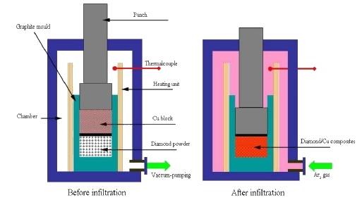 液相熔渗法是将金刚石颗粒制备成具有一定强度的预制体,而后熔融状态的铜在毛细作用或压力作用下填充至金刚石颗粒之间的缝隙中,冷却后得到复合材料。无压熔渗需要将复合材料置于基体金属熔点以上长时间保温,依靠毛细管效应实现熔渗,然而这种工艺需要增强体和基体具有较好的润湿性,并且熔渗效率低。