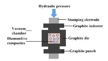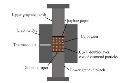 放电等离子烧结法(SPS)能够使材料粉末在低于熔点的温度下进行致密烧结,并且烧结时间短、效率高。该工艺是对金刚石和铜的混合粉体施加开-断式高能脉冲电流和一定压力,在颗粒间激发等离子体,粒子流的高速运动使粉末表面吸附的气体逃逸,并破坏了粉末表层的氧化膜。脉冲电流对混合粉体起到了活化和净化的作用,使其能够在较低的烧结温度和较短的烧结时间下形成致密的金刚石/铜复合材料。