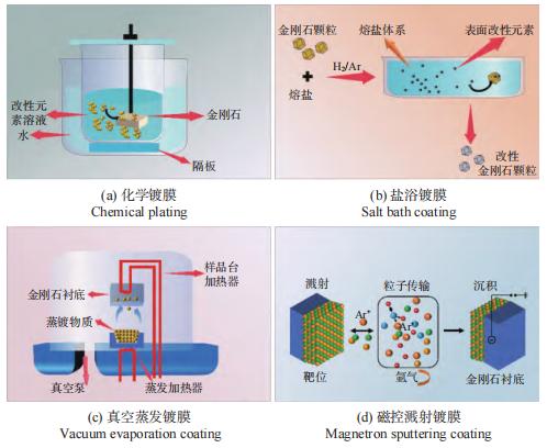 金刚石表面金属化是指采用不同镀覆工艺在金刚石颗粒表面镀覆金属碳化物层或金属。与基体合金化相比,金刚石表面金属化能够在不影响基体导热性的前提下,有目的地优化复合材料界面。在复合材料制备过程中,可以通过调控镀覆参数直接控制镀层的成分、厚度等,使金属或碳化物镀层与金刚石和铜形成良好的界面结合。常用的金刚石表面金属化方法主要有化学镀膜、盐浴镀膜、真空蒸发镀膜以及磁控溅射镀膜等。