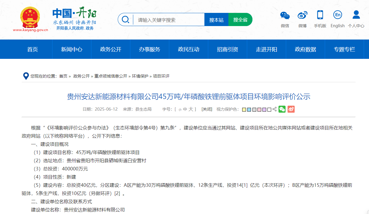 中国粉体网讯 近日,据开阳县人民政府网消息,贵州安达新能源材料有限公司45万吨/年磷酸铁锂前驱体项目环境影响评价正式公示。