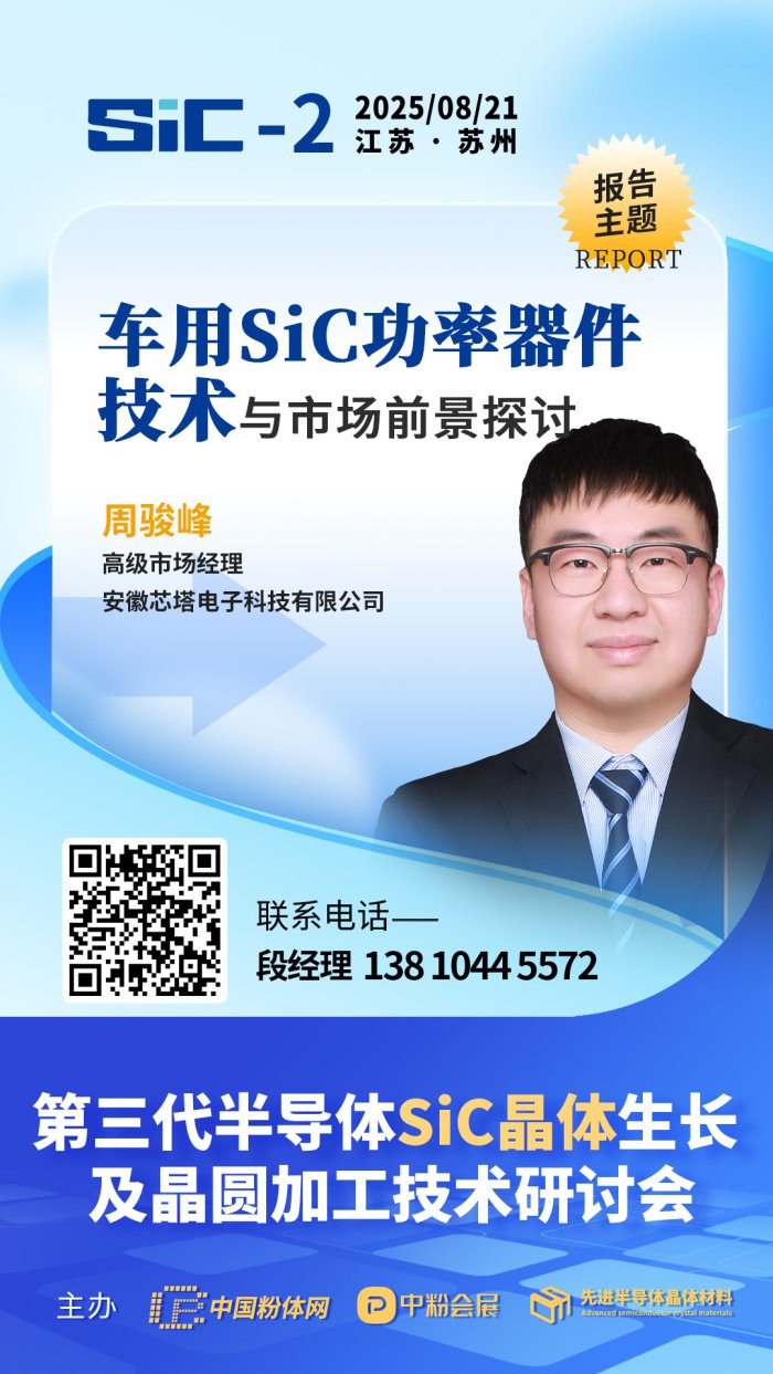 2025年8月21日,中国粉体网将在苏州举办第三代半导体SiC晶体生长及晶圆加工技术研讨会。届时,来自安徽芯塔电子科技有限公司高级市场经理周骏峰将带来《车用SiC功率器件技术与市场前景探讨》的报告。