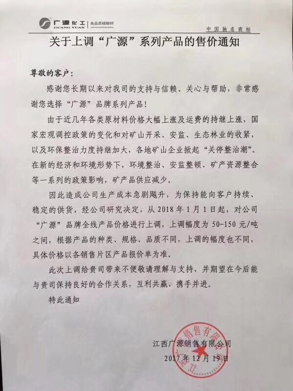 中国粉体网讯 2017年12月19日,国内碳酸钙龙头企业广源化工发布通知,经公司研究决定,从2018年1月1日起,对公司“广源”品牌全线产品价格进行上调,上调幅度为50-150 元/吨之间,根据产品的种类、规格、品质不同,上调的幅度也不同,具体价格以各销售片区产品报价单为准。