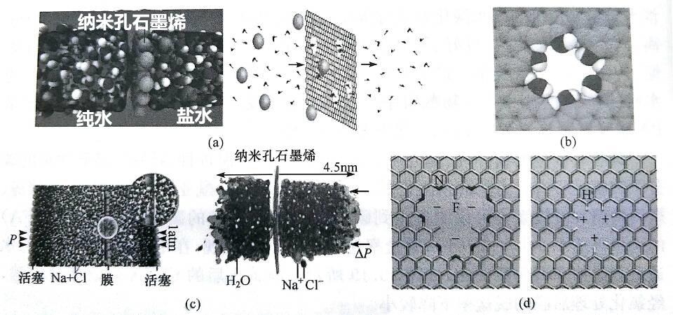 (a)纳米孔石墨烯海水淡化;(b)带有亲水键的纳米孔;(c)计算机模拟石墨烯过滤;(d)带有亲水键纳米孔(左)和官能化的纳米孔(右)