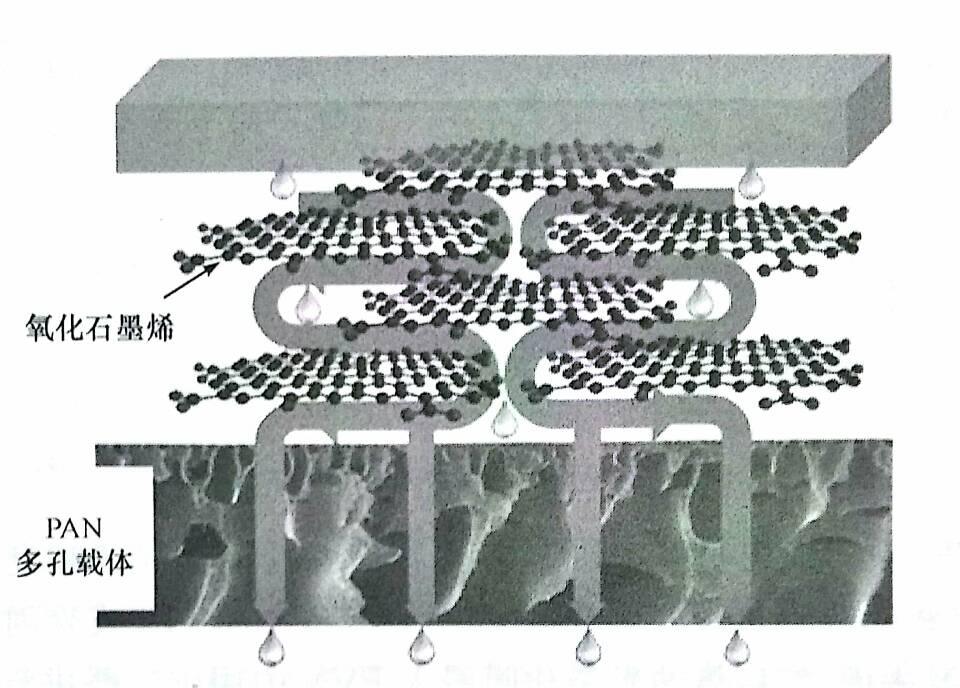 氧化石墨烯膜是近年来才研制出的一种新型可以用于海水淡化的膜,其具有制备简单,机械强度高,可工业化生产。氧化石墨烯(GO)片层可以堆叠成单层膜,膜上有数百万纳米毛细管。小的离子可以快速穿过GO膜,吸收的离子对膜的渗透性能没有影响,主要影响膜渗透速率的是水合半径。