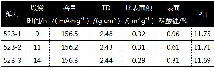 NCM523在不同煅烧时间下的样品性能