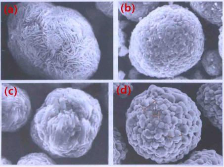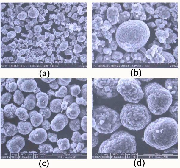 (a)、(b)为粒度分布较宽的前驱体煅烧出的成品的SEM图;(c)、(d)为粒度分布较窄的前驱体煅烧出的成品的SEM图